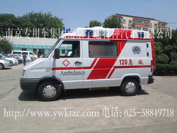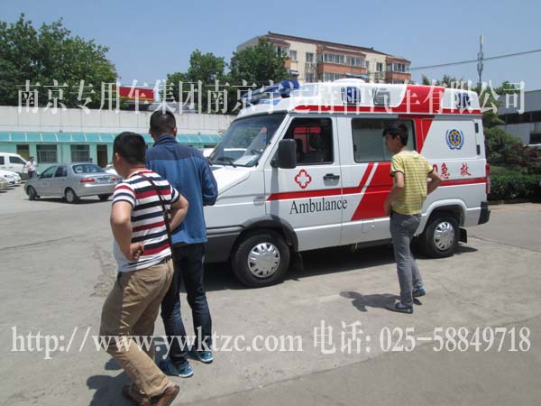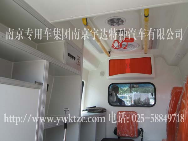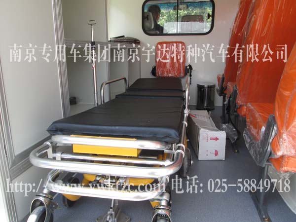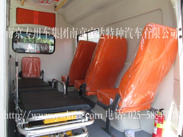 A35玻璃一体式模具内饰、2.5升排量、副驾驶双人座椅、驾驶员后侧长条柜(W=40CM)、副驾驶后侧3个单人座椅、顶置换气扇、医用地板、照明灯、逆变电源、隔断后翻板座椅、输液挂钩、紫外线消毒灯、垃圾桶、后空调、后上车踏板、长条警灯、四周爆闪灯、自动上车担架、前后对讲系统、车辆外观等。